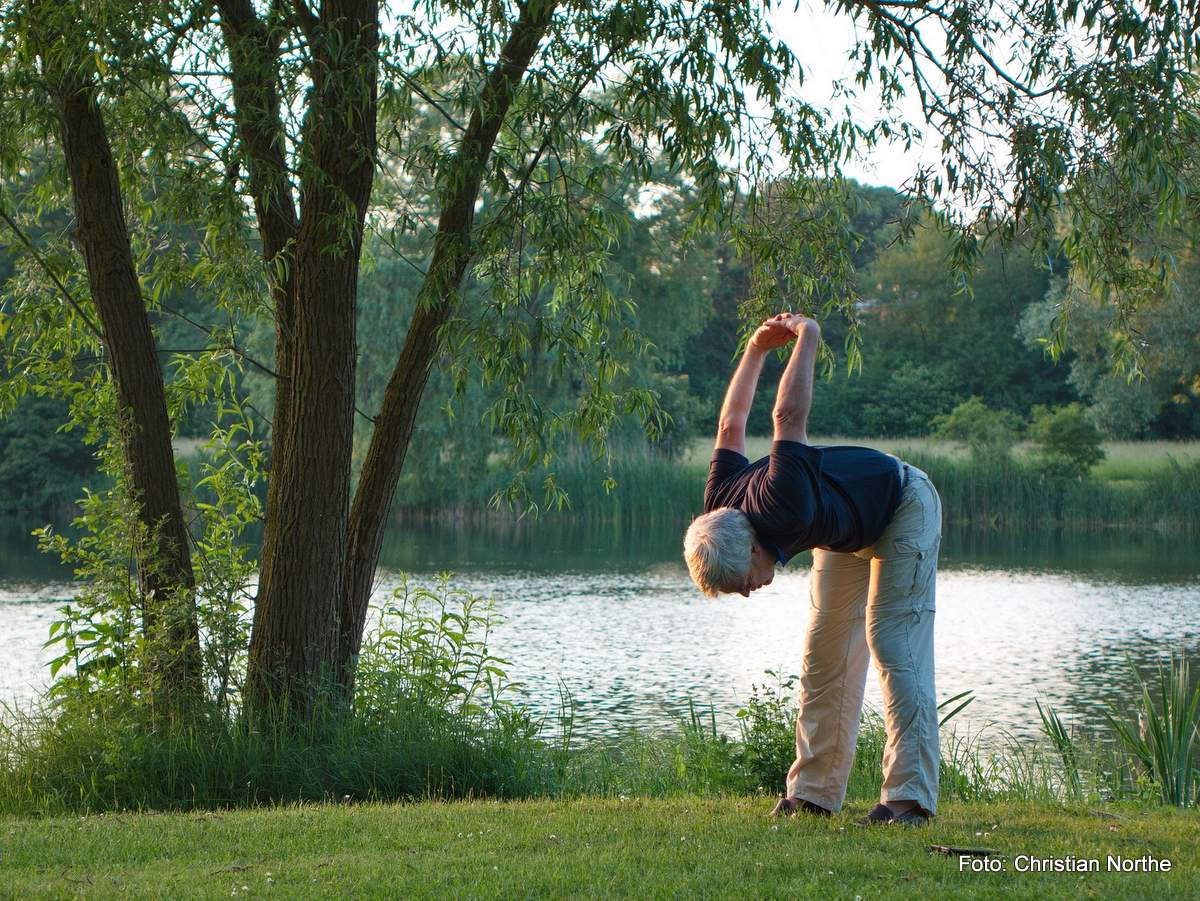 Die Oberkörperdehner-Übung dient der Beweglichkeit des Oberkörpers. Man beugt sich nach vorne und umfasst die Knöchel, ähnlich wie ein Katzenbuckel. Der Kopf bleibt locker hängen und die Dehnung wird durch ein leichtes Ziehen verstärkt. Ca. 30 Sekunden sollte man in dieser Haltung bleiben, danach richtet man sich langsam Wirbel für Wirbel wieder auf.